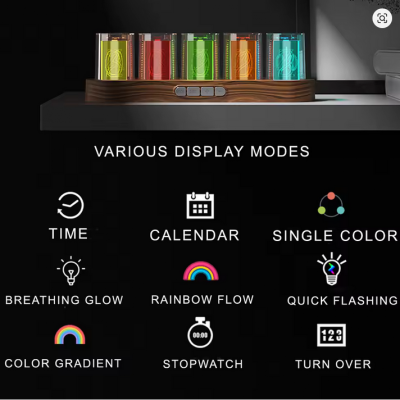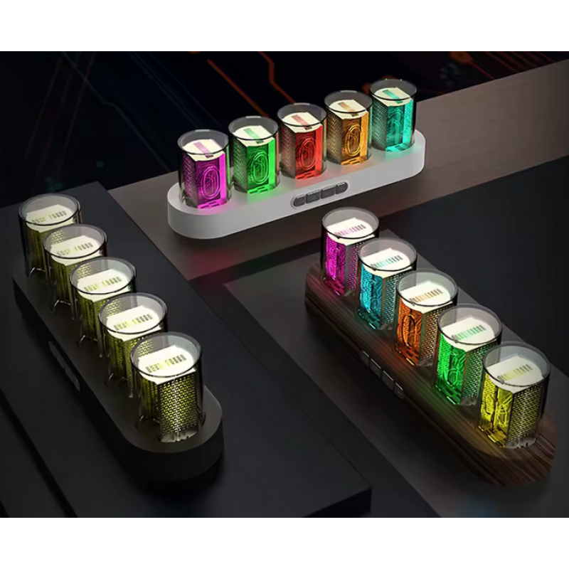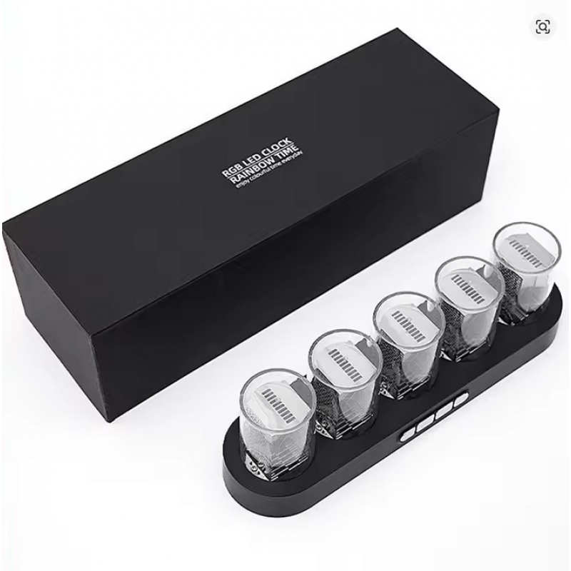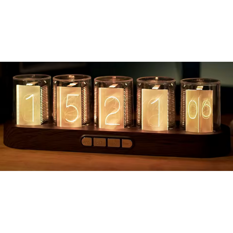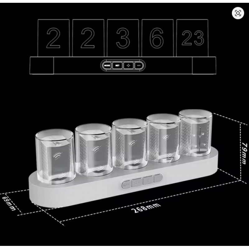 Auf dem Grundkörper sind fünf Röhrenkolben aufgesetzt. Die ersten vier Stellen für Stunden und Minuten, die letzte Stelle für Sekunden.